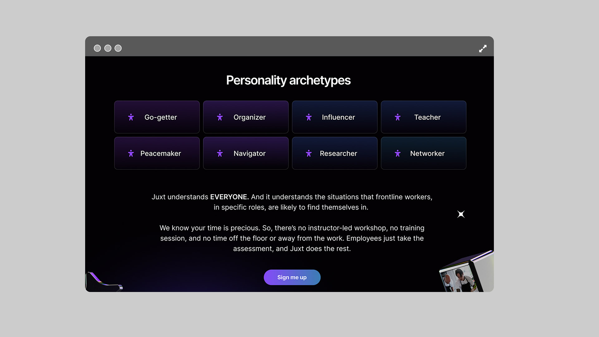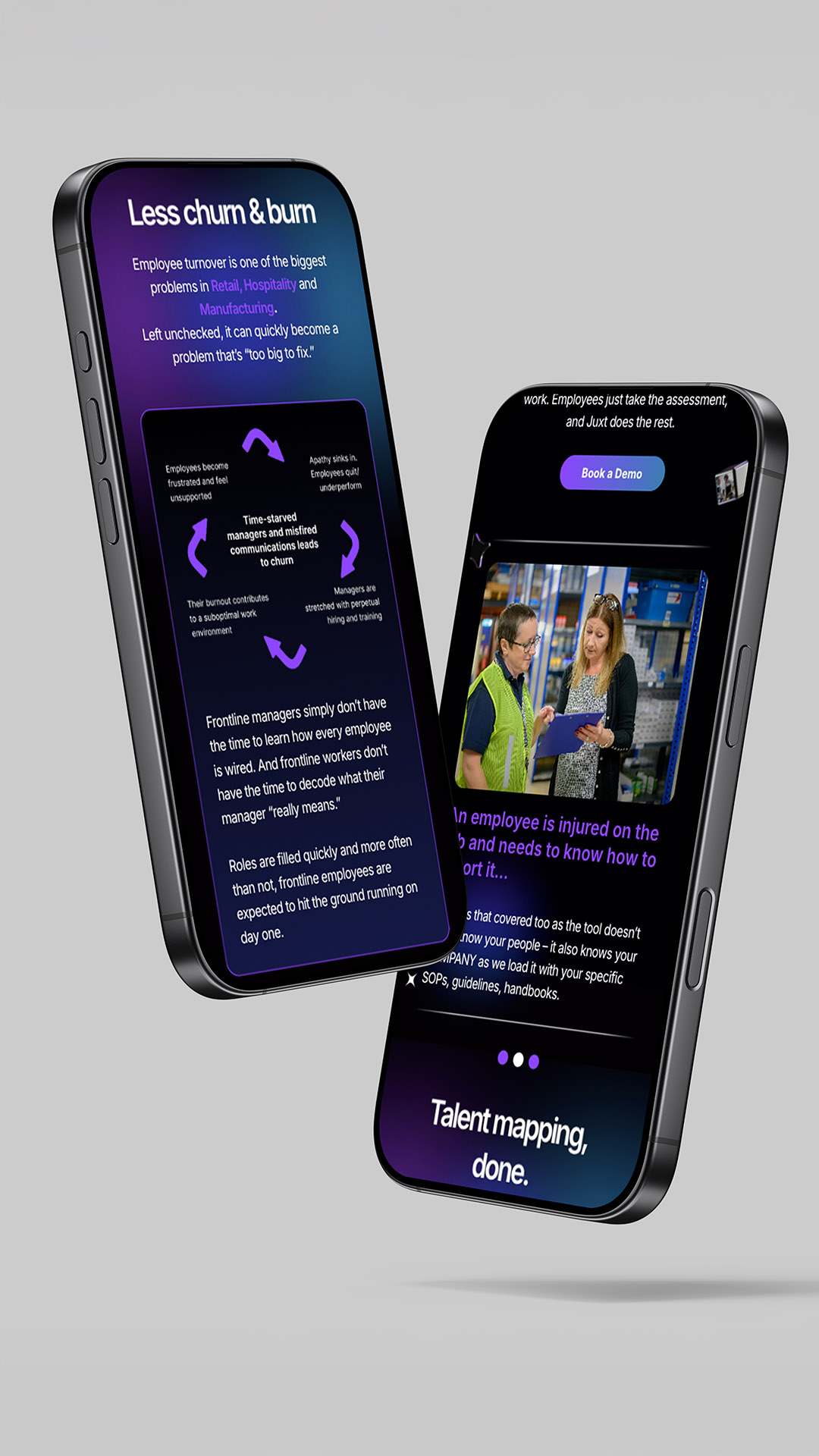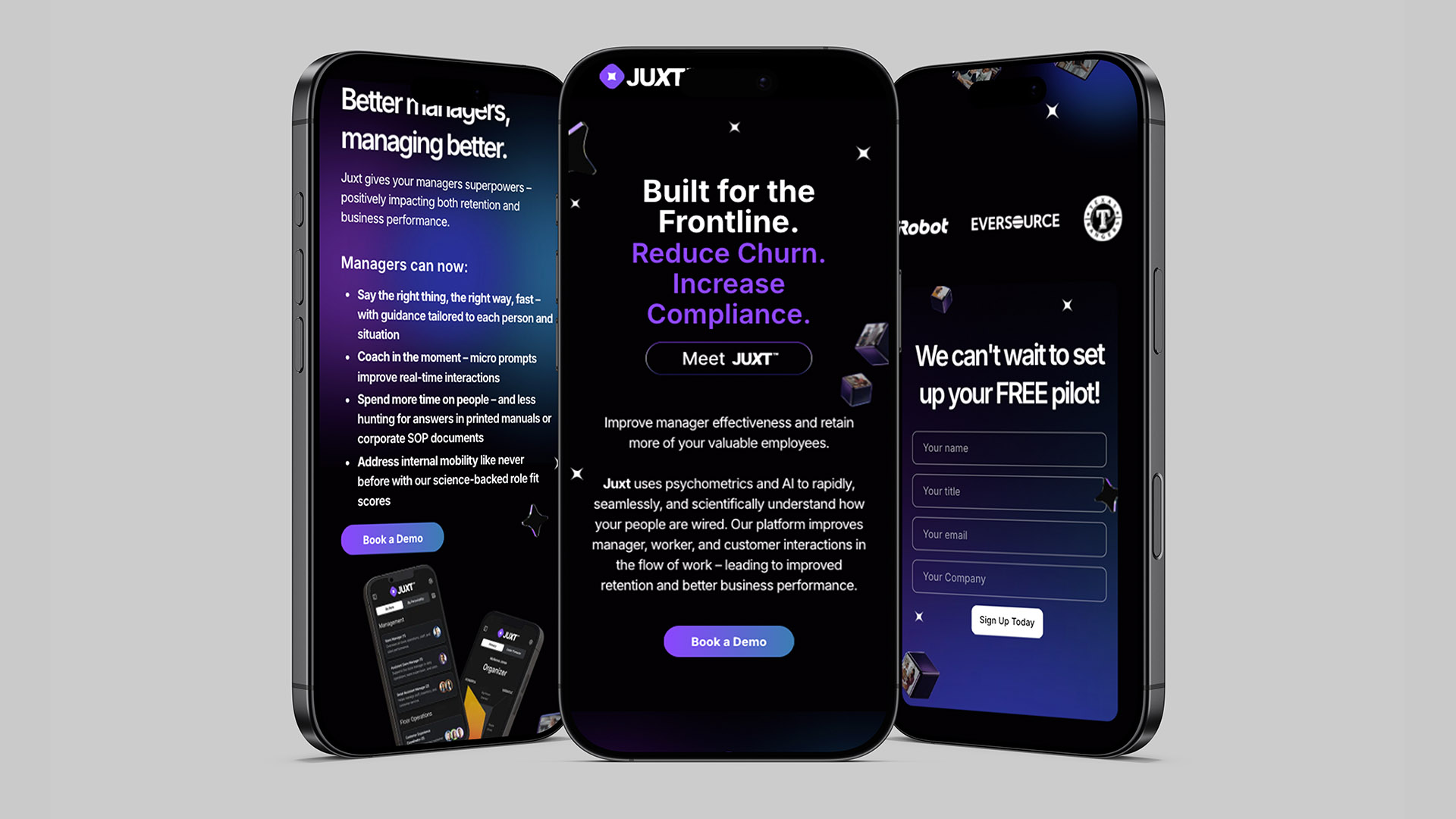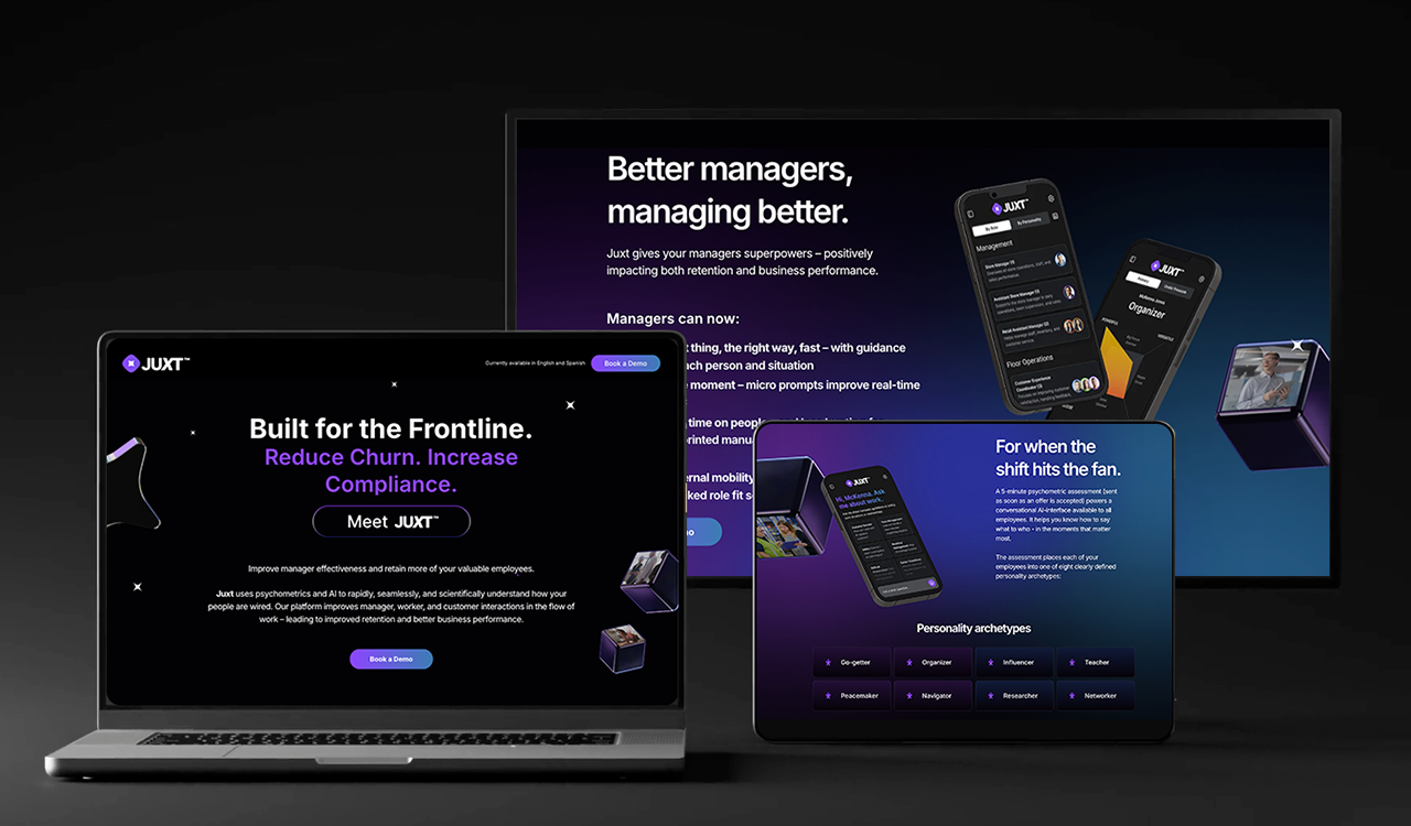 Juxt is an AI-powered psychometric platform designed to scientifically and seamlessly understand how individuals are wired, aiming to improve manager, worker, and customer interactions directly in the flow of work to boost retention and business performance. The objective was to introduce Juxt to a B2B audience of frontline managers, specifically connecting with leaders and managers in the Retail, Hospitality, and Manufacturing sectors, clearly communicating the platform's key features, and driving visitors to sign up for the pilot program.